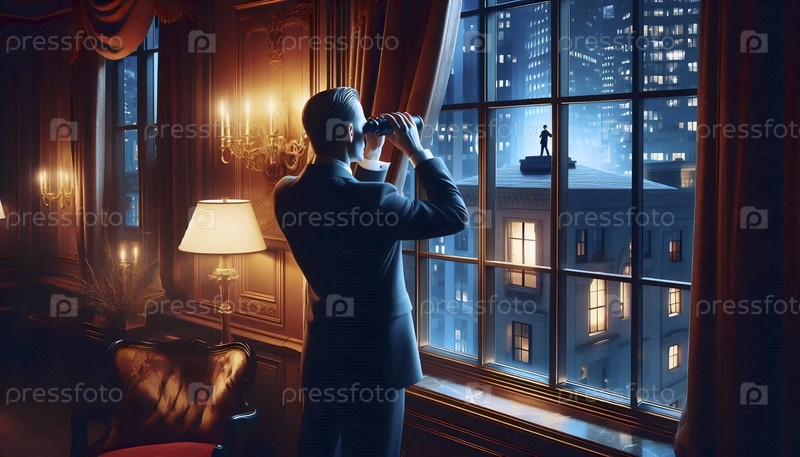 Генеральный директор в пентхаусе смотрит на уличную танцовщицу на крыше через бинокль, Ai generated image
