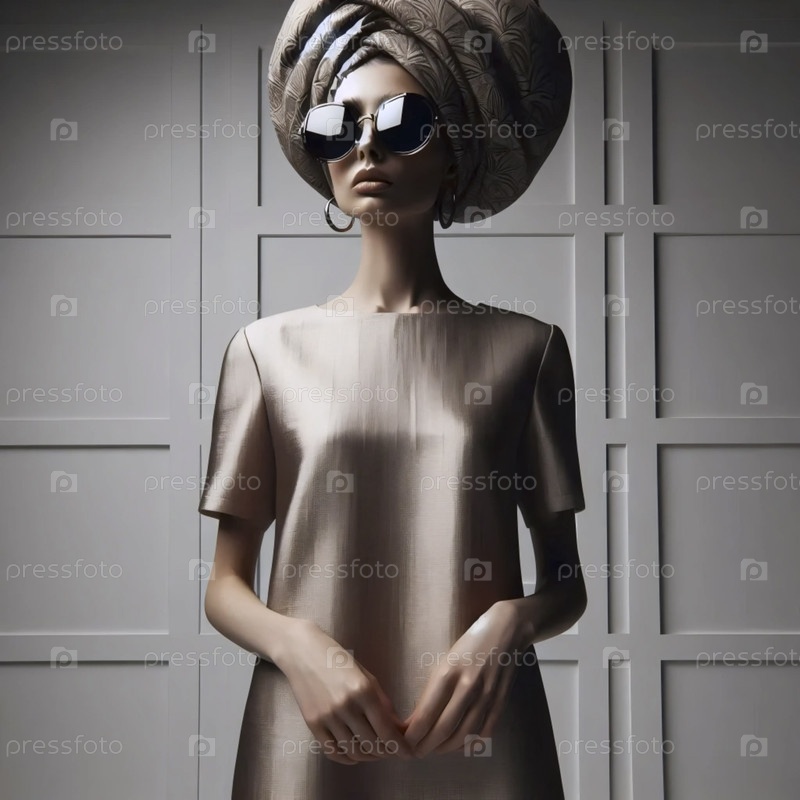 Модель в тюрбане и больших круглых солнцезащитных очках, снятая под низким углом против геометрической стены, Ai создала изображение