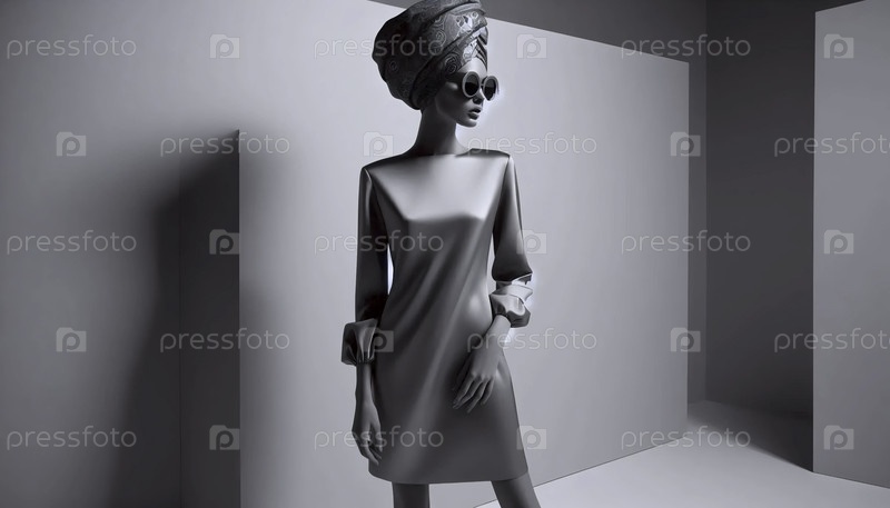 Модель в тюрбане и больших круглых солнцезащитных очках, снятая под низким углом против геометрической стены, Ai создала изображение