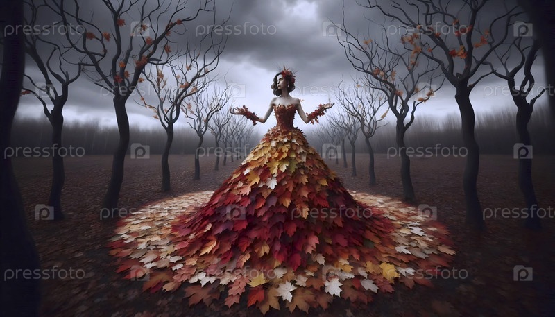 Невеста в одежде из осенних листьев стоит вокруг мертвых деревьев, Ai generated image