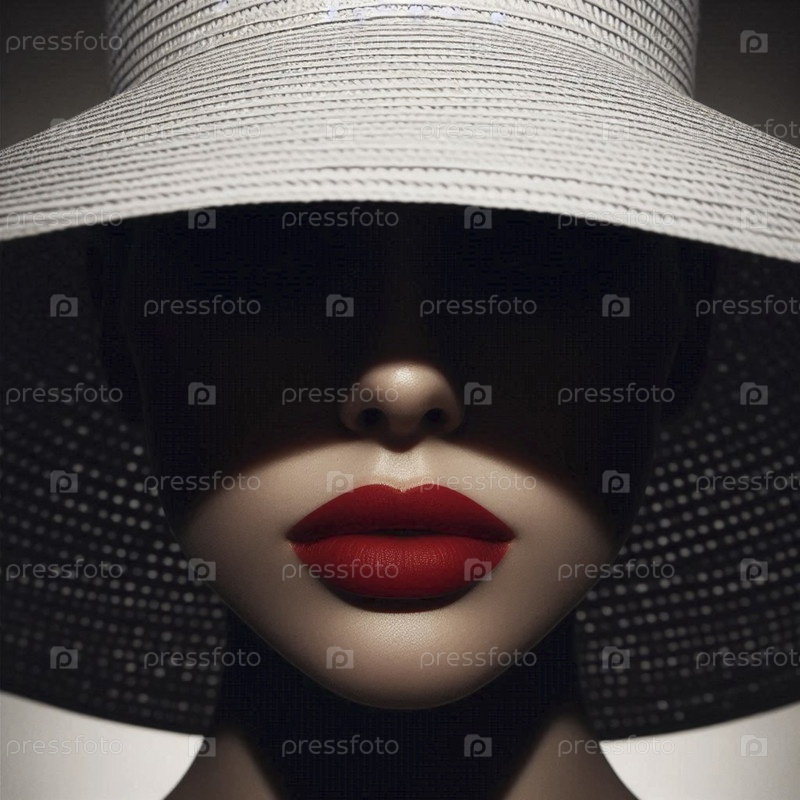 Широкошерстная шляпа, бросающая глубокую тень на лицо модели, видны только ее красные губы, Ai generated image