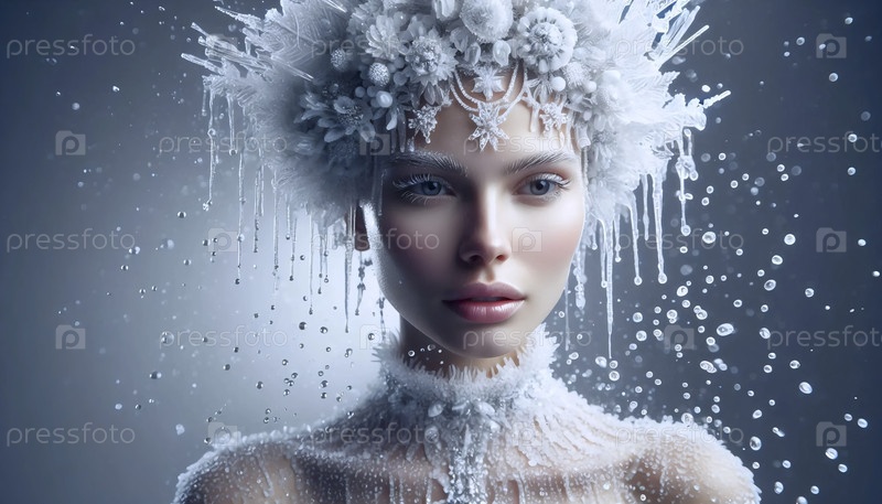 Невеста в головном уборе из сложных, замороженных кристаллов льда, которые медленно тают, Ai generated image