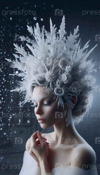 Невеста в головном уборе из сложных, замороженных кристаллов льда, которые медленно тают, Ai generated image