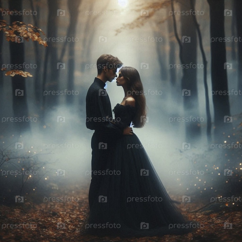 Невеста и жених делятся дыханием, их лбы касаются друг друга в туманной лесной равнине, Ai generated image