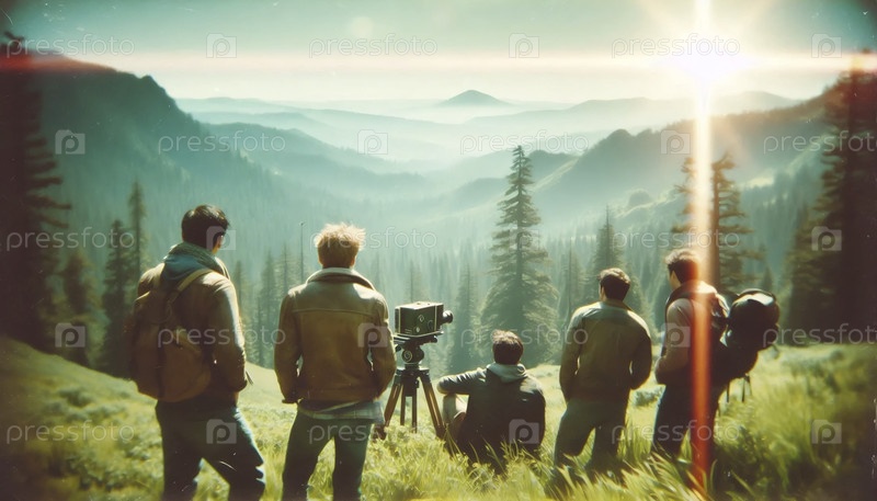 Группа друзей на пешеходной дорожке, останавливающихся за выпивкой в столовой, с обширным живописным видом позади них слегка переосмысленный, Ай создал изображение