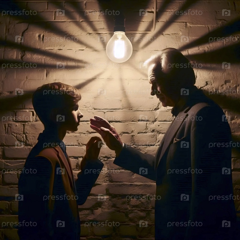 Ветеран театрального актера, обучающего молодого протеже, их тени огромны на стене за кулисами