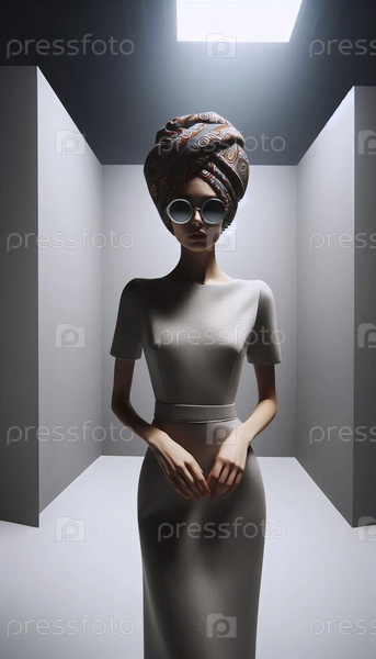 Модель в тюрбане и больших круглых солнцезащитных очках, снятая под низким углом против геометрической стены, Ai создала изображение