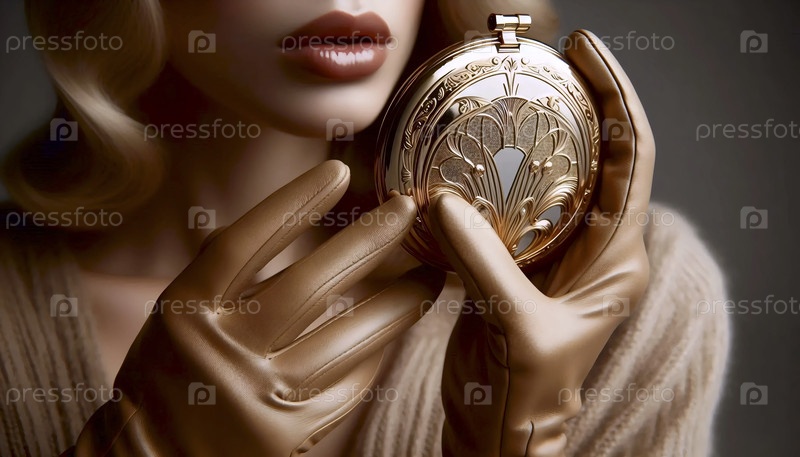 Пара рук в бежевых детских кожаных перчатках, держащих винтовое компактное зеркало открытым, Ai generated image