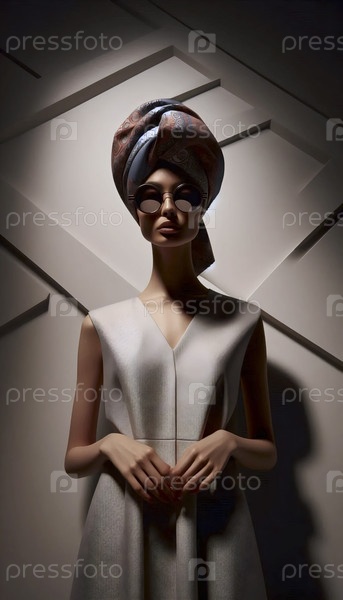 Модель в тюрбане и больших круглых солнцезащитных очках, снятая под низким углом против геометрической стены, Ai создала изображение