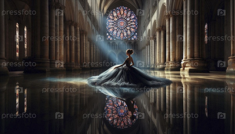 Невеста в черном тульском платье встает на колени в затопленном соборе, Ai generated image