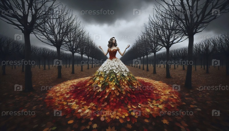 Невеста в одежде из осенних листьев стоит вокруг мертвых деревьев, Ai generated image
