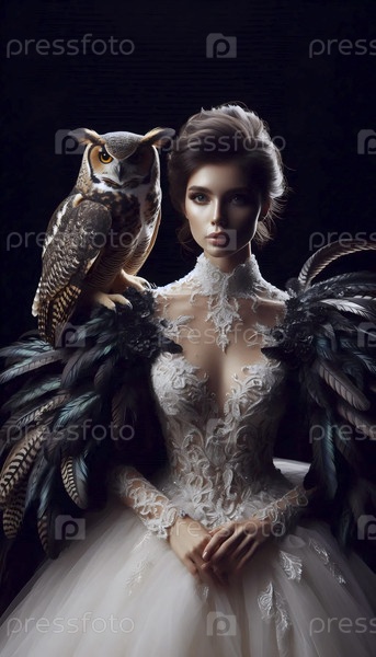 Невеста в пернатом плаще с большой рогатой совой, сидящей на ее плече, Ай создала изображение