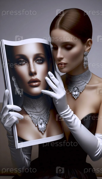 Женщина в руках детской перчатки переворачивает страницу модного журнала со своей собственной фотографией, Ai generated image
