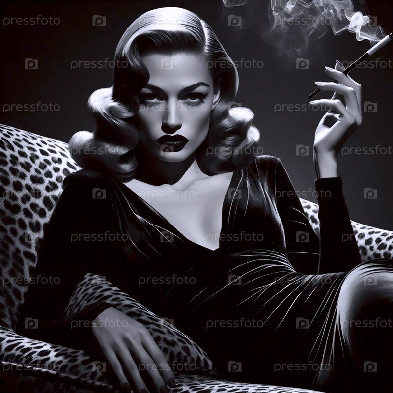 Смертельная женщина 1940-х годов в черном бархатном платье, прислонившись к дивану с принтом леопарда, Ai generated image