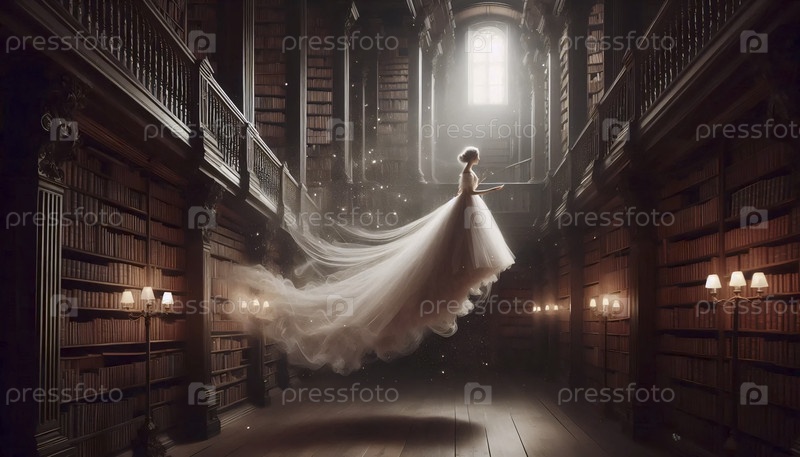 Невеста, висящая в воздухе сотнями невидимых нитей в большой библиотеке, Ai generated image