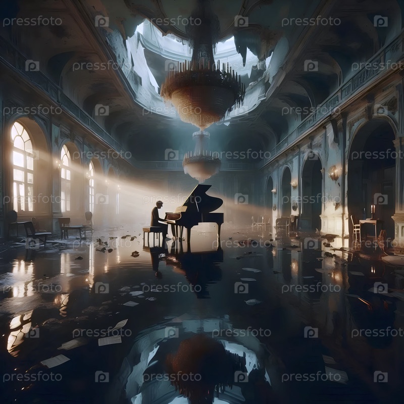 Музыкант, играющий на пианино, который наполовину погружен в затопленный бал-зал с украшениями, Ai generated image