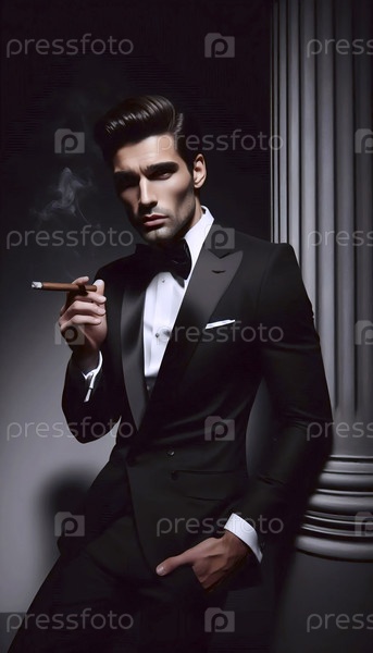 Харизматичный актер в индивидуальном смокинге, опирающийся на столб с одной рукой в кармане, Ай создал образ