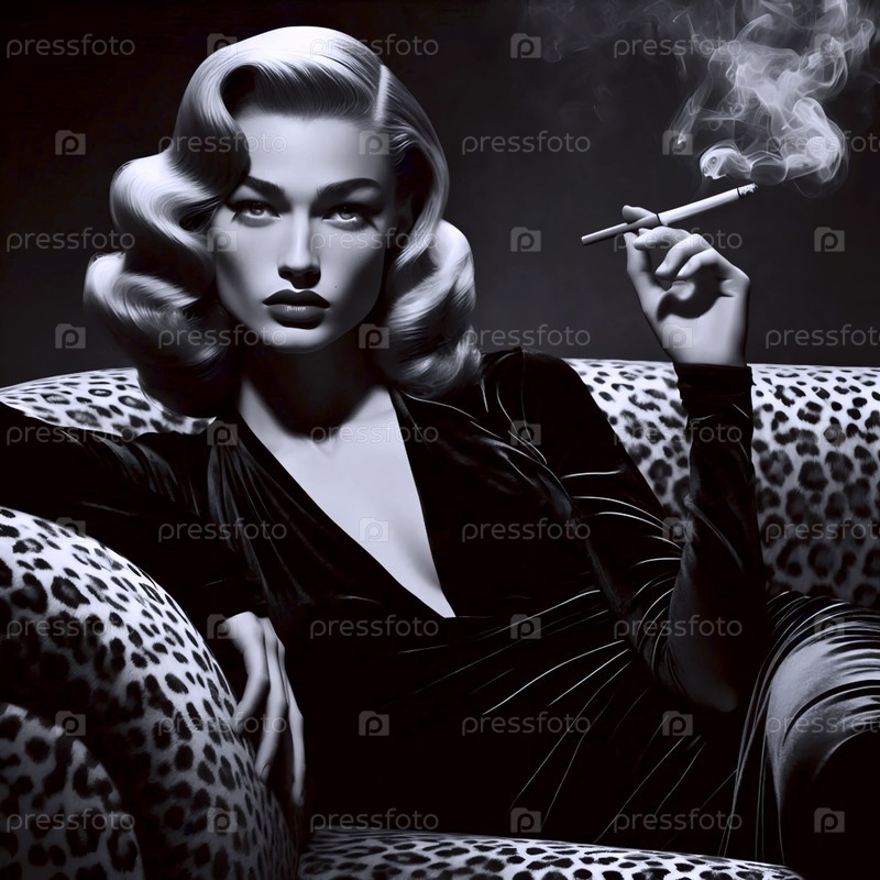 Смертельная женщина 1940-х годов в черном бархатном платье, прислонившись к дивану с принтом леопарда, Ai generated image
