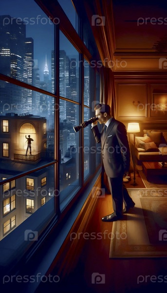 Генеральный директор в пентхаусе смотрит на уличную танцовщицу на крыше через бинокль, Ai generated image