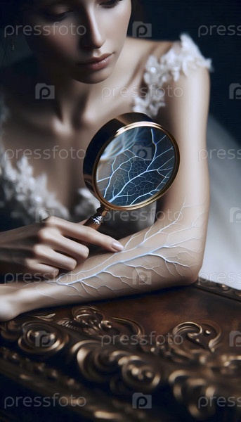 Невеста изучает свои собственные цветущие вены как ботанический образец под лупой, Ai generated image