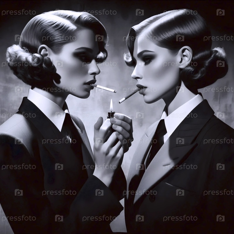 Две женщины в костюмах по индивидуальному заказу, одна зажигает сигарету другой, лица близко, глаза закрыты, Ай создал изображение