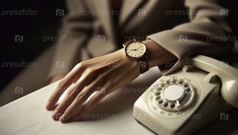 Женское запястье, носящее тонкие золотые часы, ее рука опирается на телефонный циферблат старинного ротационного телефона