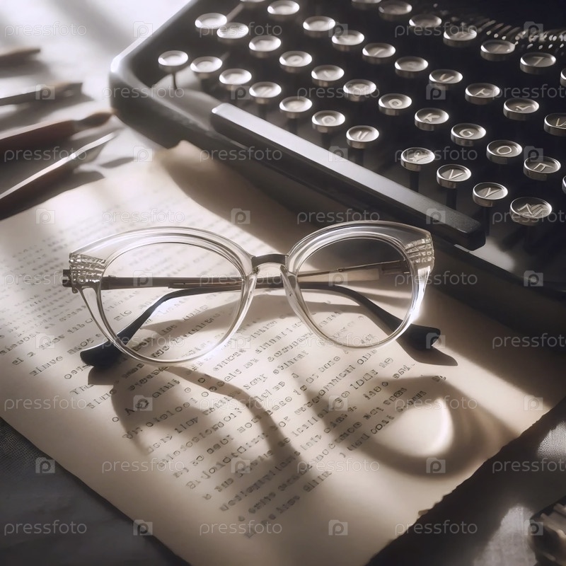 Пара очков для кошачьих глаз, опираясь на открытую пишущую машинку с листом бумаги, содержащей стихотворение, Ай создала изображение