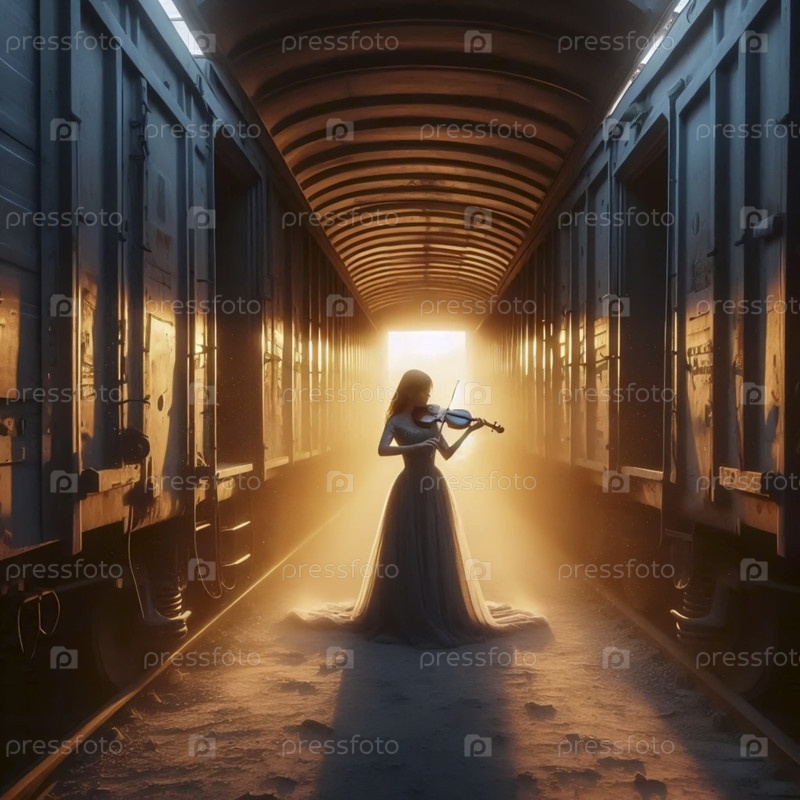 Скрипач практикуется в пустом, ржавом вагоне грузового поезда на закате, Ai generated image