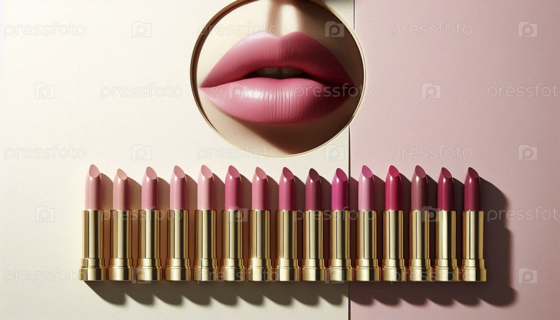 Линейка труб для помады в различных оттенках розового цвета, с ртом модели в центре носящей один оттенок, Ai создала изображение