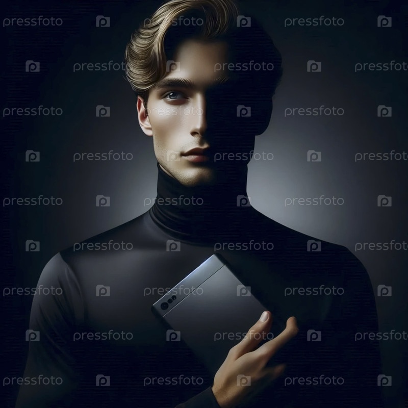 Технологический провайдер в черном гардеробе, освещенный драматическим chiaroscuro, элегантное устройство в руке, Ai создал изображение