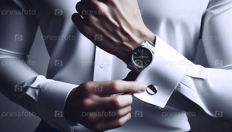 Ближайшее изображение часов на запястье мужчины, когда он регулирует кнопку наручников хрустящей белой рубашки, Ai generated image