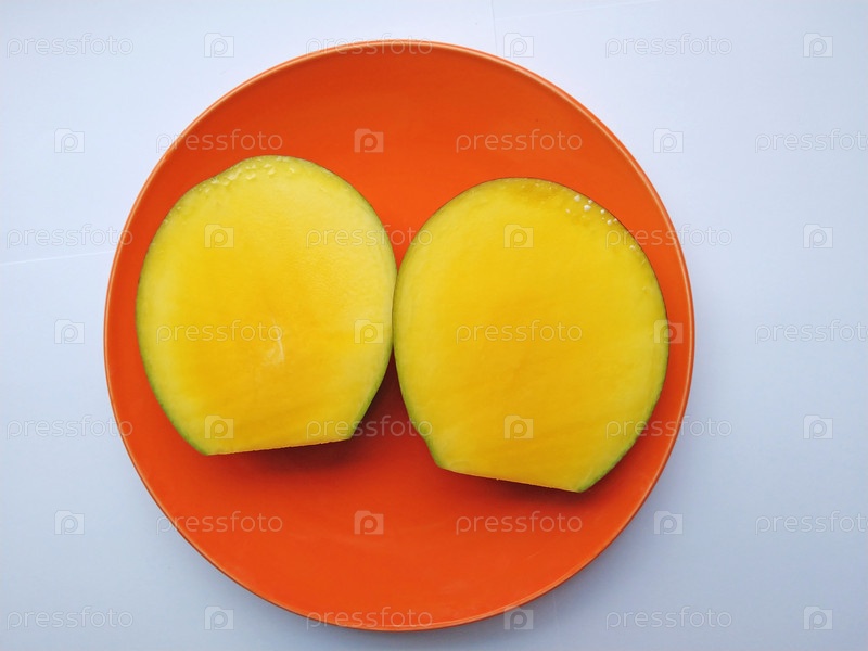 Две половины спелого сочного манго лежат на тарелках на белом фоне.Вкусная и здоровая еда для детей и взрослых.Витамины и минералы.Диета и правильное питание