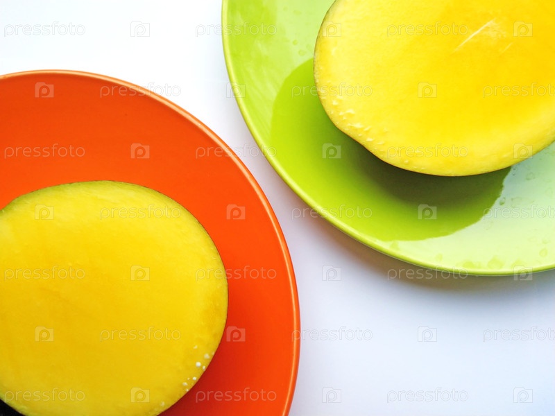 Две половины спелого сочного манго лежат на тарелках на белом фоне.Вкусная и здоровая еда для детей и взрослых.Витамины и минералы.Диета и правильное питание