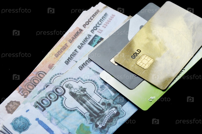 Российские рубли и пластиковые банковские карты на черном фоне. экономика страны в период санкций и финансового кризиса. коррупция и взятки. покупка, продажа, аренда недвижимости