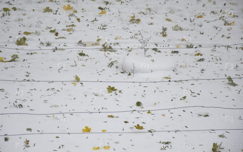 Земля, покрытая тонким слоем снега и выпавшими желтыми и зелеными листьями. небольшое заснеженное пространство с выступающим из него тонким растением. атмосфера ранней зимы