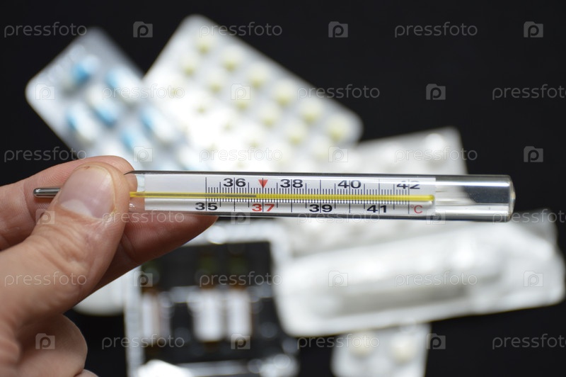 Рука с ртутным термометром на фоне таблеток и лекарств. эпидемия, вирус в сезон заболеваемости. повышение температуры тела во время болезни. лечение и профилактика