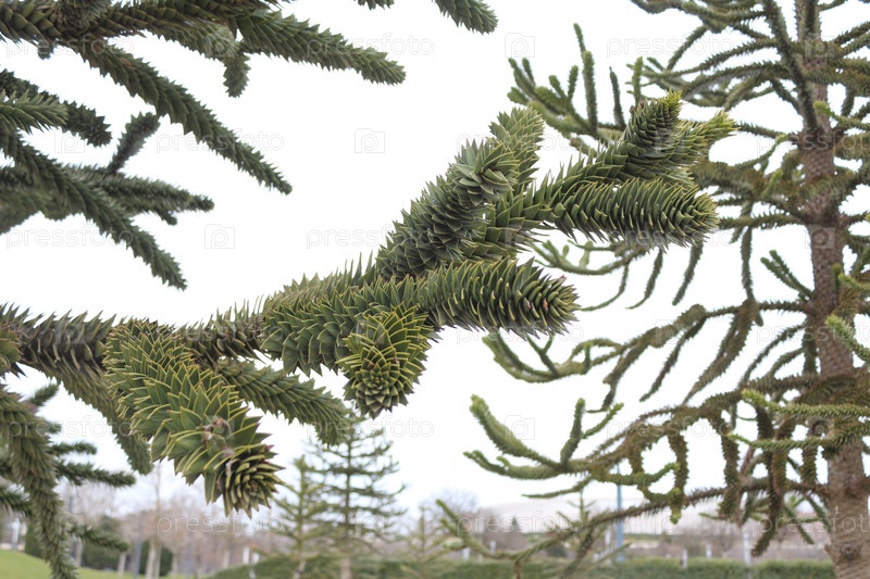 Ветка араукарии чилийской в крупном плане / Chilean araucaria branch close-up
