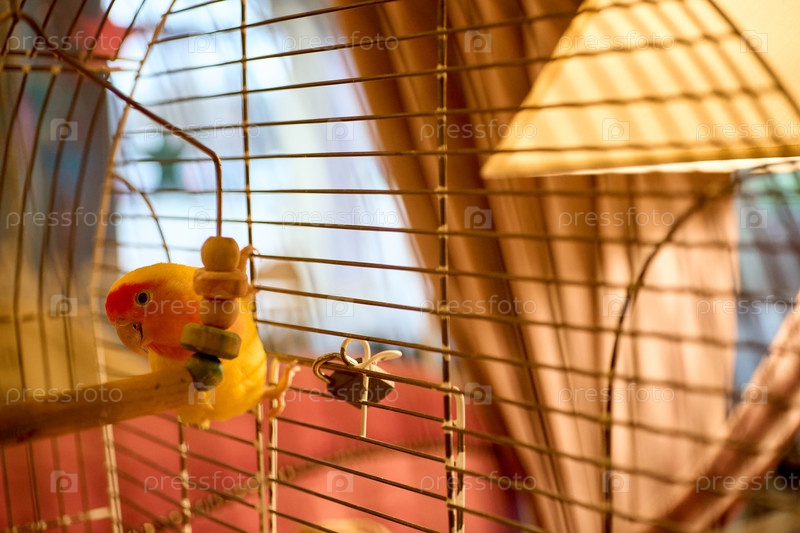 Желто-красный попугай в домашней клетке