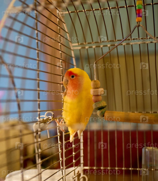 Яркий попугай с красивым оперением в клетке
