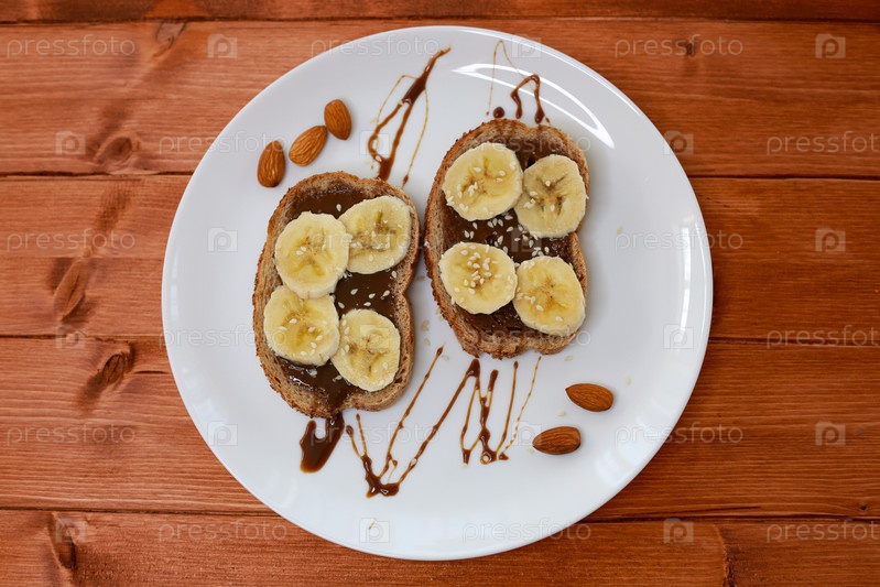Бананы с шоколадной пастой на свежем поджаренном белом хлебе