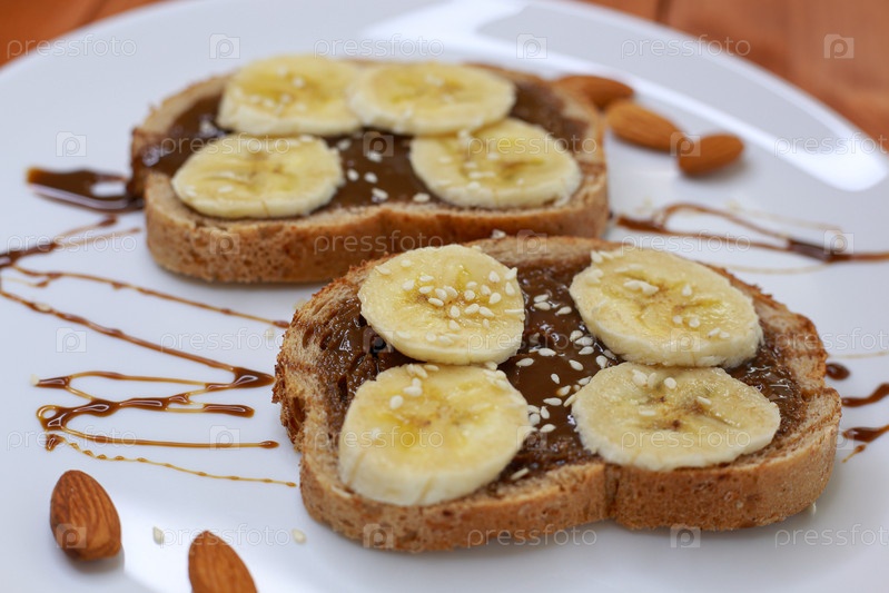 Бананы с шоколадной пастой на свежем поджаренном белом хлебе