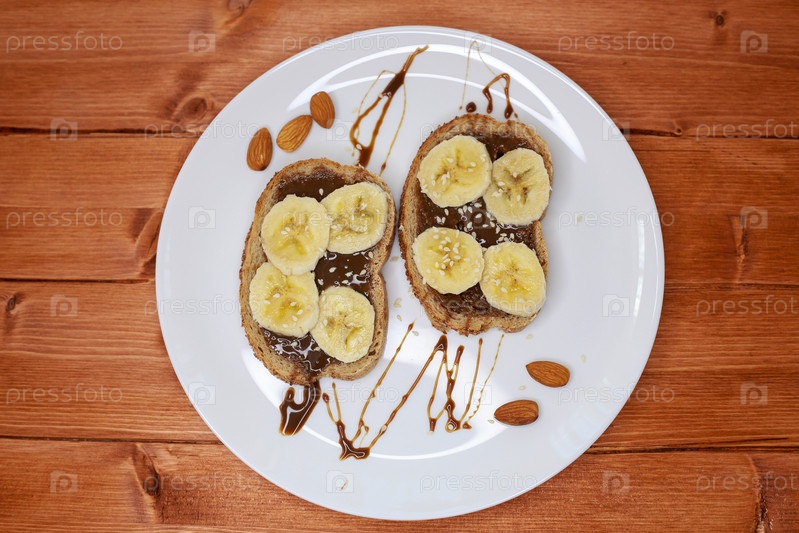 Бананы с шоколадной пастой на свежем поджаренном белом хлебе