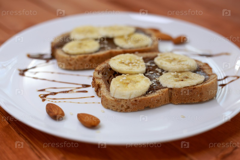 Бананы с шоколадной пастой на свежем поджаренном белом хлебе