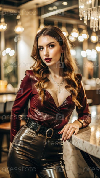 Элегантная женщина в блестящем коричневом наряде позирует ночью в слабо освещенном баре