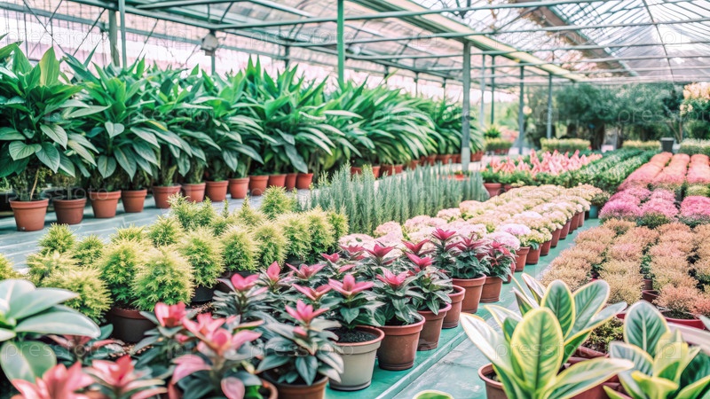Питомник растений с яркой зеленью и красочными цветами при дневном свете