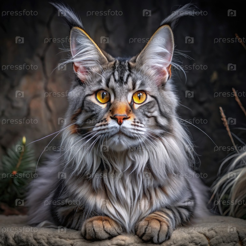 Величественный кот Мэн-Кун с ярко желтыми глазами сидит в лесу