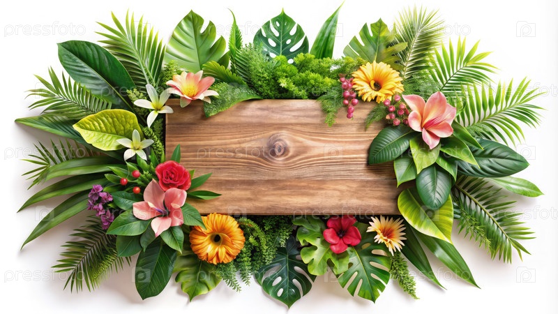 Деревянный знак в окружении ярких тропических цветов и пышной зелени