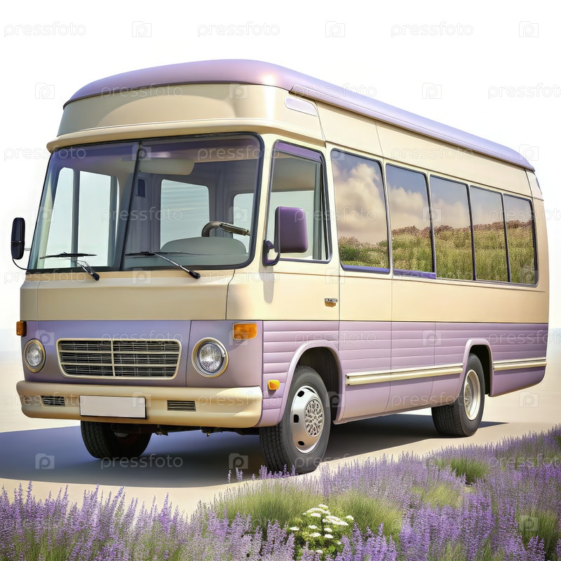 Длинный автобус с лиловой цветовой гаммой, припаркованный возле поля цветков