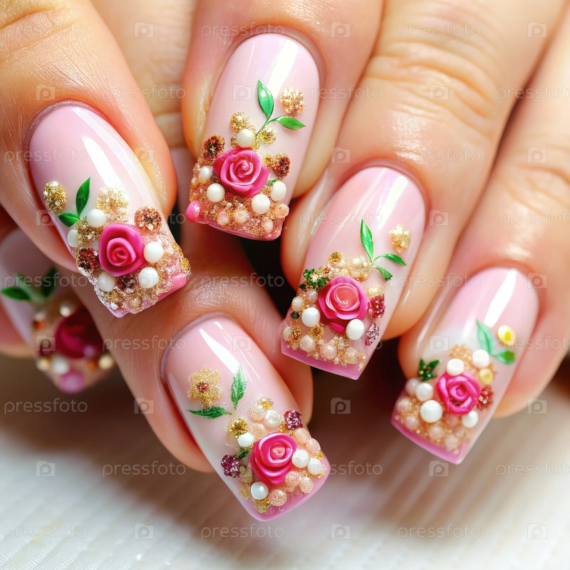 Элегантное цветочное мастерство ногтей с розовыми розами и золотыми акцентами в студии красоты