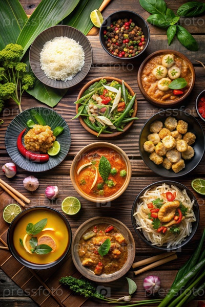 Вибрирующий выбор тайской еды со свежими ингредиентами и традиционными блюдами